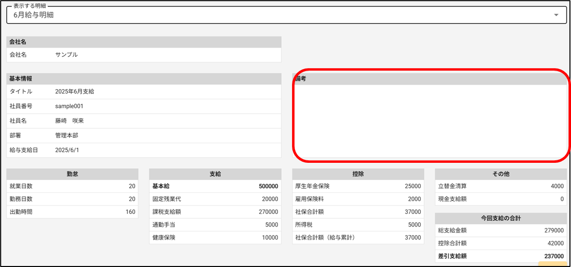 給与明細の項目名・備考欄に文字数の上限はありますか? 2025年08月12日 07:24 更新 ございません。文字数に上限はなく、無制限です。備考欄の文字数が多い場合、従業員が給与明細を閲覧する際には、スクロールバーで下にスクロールして閲覧します。※備考欄が大きくなってPDF1枚に入り切らない場合、PDFが2枚以上になります。