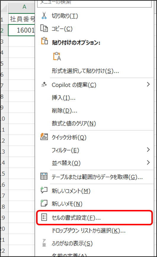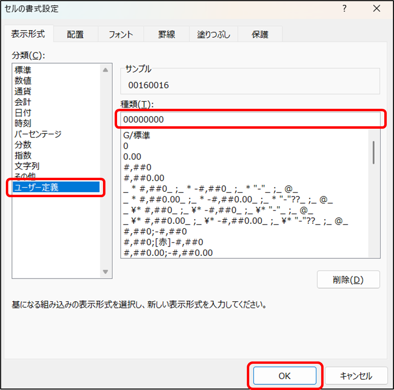 CSVファイルをExcelで開いた際、頭に「0」をつけてデータを保存できますか? 2026年03月30日 06:48 更新 以下2つの方法で保存が可能でございます。※Excelのバージョンによっては画面が異なる可能性がございます。 セルの書式設定で「ユーザー定義」を選択する(社員番号のように、数字の頭に「0」を付けたい場合に使用します) セルの書式設定で「日付」を選択する(日付に対して「0」を付けたい場合に使用します) セルの書式設定で「ユーザー定義」を選択する1.数字の頭に「0」をつけたい項目(今回は社員番号)のセルを右クリックし、[セルの書式設定]をクリックします。2.表示形式から「ユーザー定義」を選択し、種類の欄に社員番号の桁数分「0」を入力し、[OK]をクリックします。(例)社員番号が「00160016」の場合→8桁なので、「00000000」3.すべてのデータが変更されたことを確認したら、上書き保存します。 セルの書式設定で「日付」を選択する1.日付が入力されているセルを右クリックし、[セルの書式設定]をクリックします。2.表示形式から「日付」を選択し、種類から「○○○○-○○-○○」を選択し、[OK]をクリックします。3.すべてのデータが変更されたら、上書き保存します。 関連記事 「IPアドレス制限」で登録できるIPアドレスの数に制限はありますか?