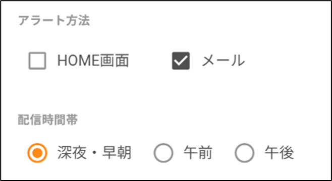 アラートをメール配信する場合の配信時間帯は、それぞれ何時を指していますか? 2025年11月21日 02:40 更新 それぞれ、以下の時間を指します。深夜・早朝:午前6時午前:午前9時午後:午後1時(13時)※上記時間から順次送信となりますので、受信までお時間がかかる可能性がございます。