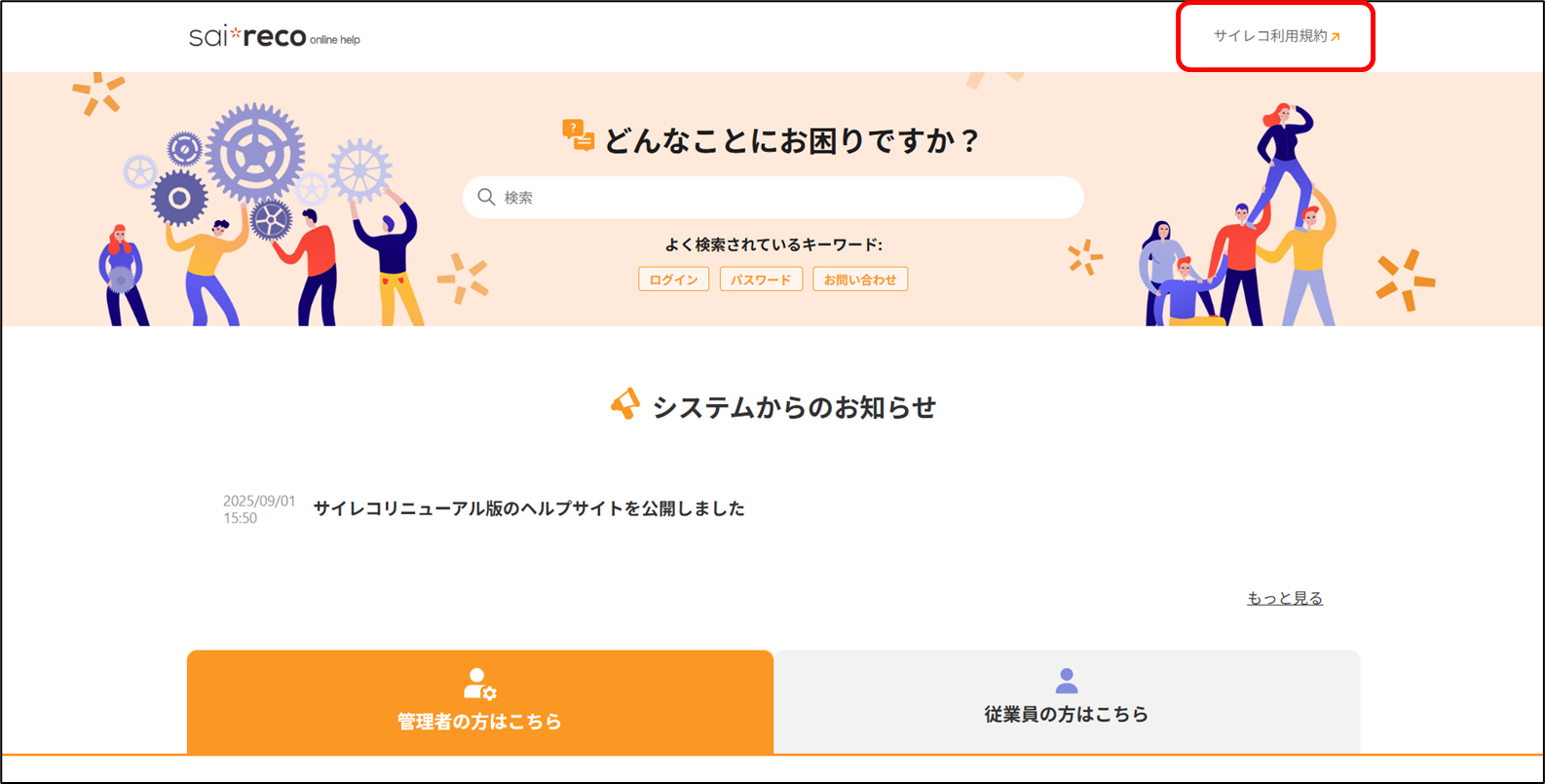 2026年2月2日更新 【改訂】サイレコ利用規約が2026年3月2日付で改訂されます 2026年02月02日 01:11 更新 改訂サイレコ利用規約を2026年3月2日付で改訂させていただきます。改訂箇所は以下をご参照ください。サイレコ利用規約改訂履歴_20260302※サイレコ利用規約は、ヘルプサイト上部の「サイレコ利用規約」よりご確認いただけます。 関連記事 【動画】初期導入手順の設定方法 初期導入手順/管理者マニュアル Coming soon 兼務部署の検索はできますか? 管理者アカウントにスマホでログインしても、画面が表示されません。どうすればいいですか?