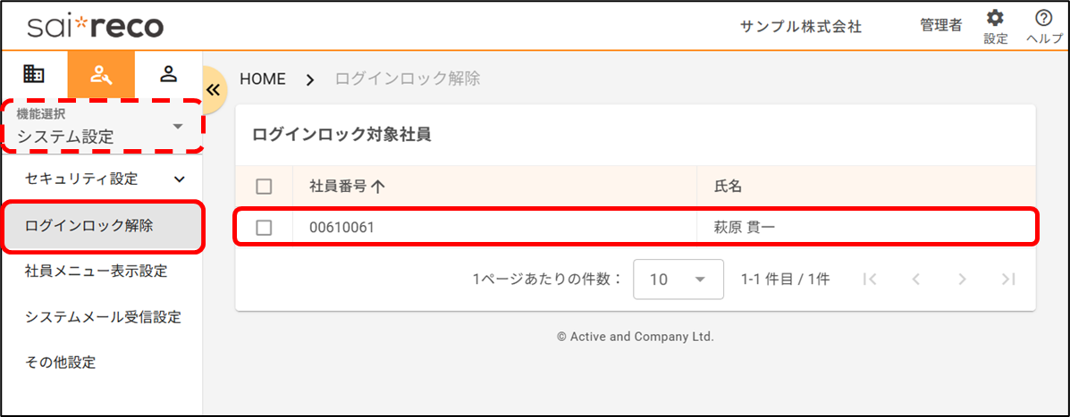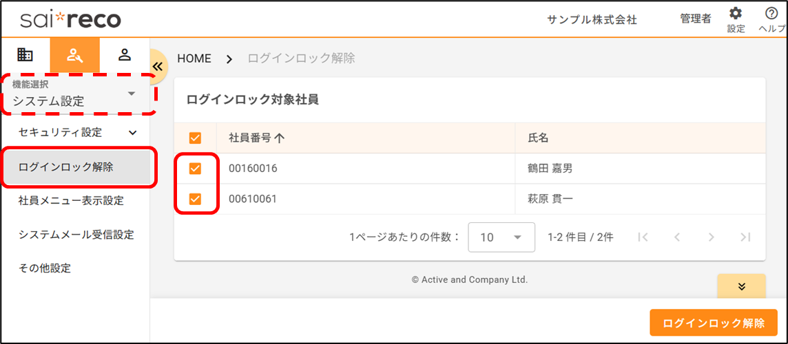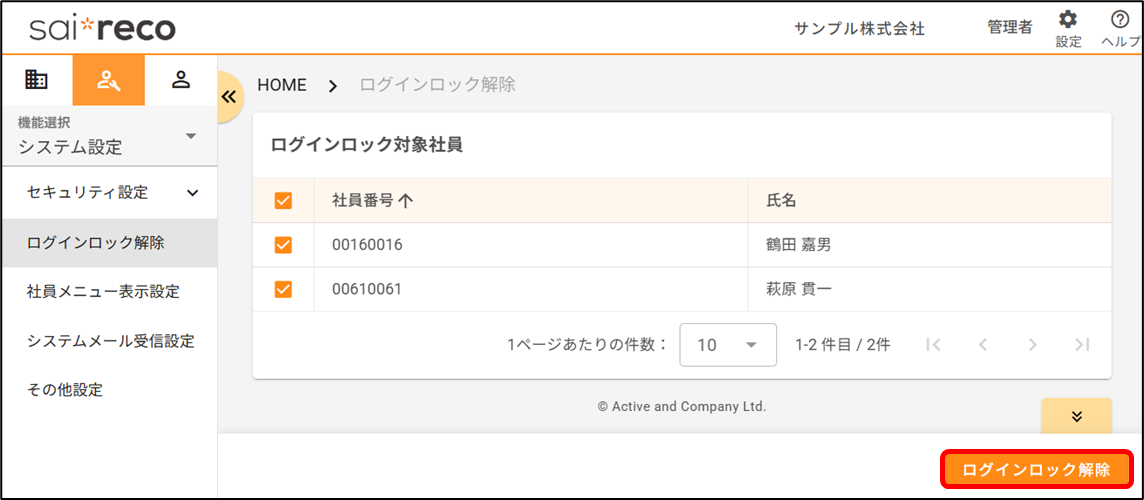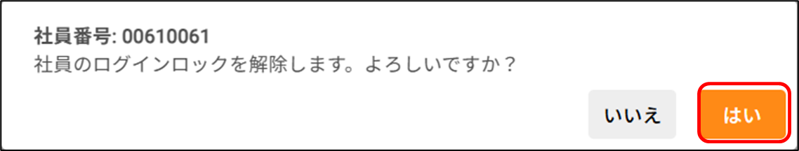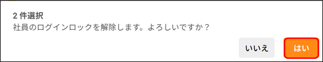 社員がログインロックされてしまいました。どのように解除しますか? 2026年01月29日 07:30 更新 時間経過、もしくは管理者の操作によって解除できます。 時間経過 管理者の操作 時間経過指定された時間が経過すると、自動で解除されます。時間指定の方法については以下のヘルプページをご確認ください。ログインロックとは何ですか?管理者の操作ログインロックの解除は、個社管理者のみ実施可能です。[システム設定>ログインロック解除]から操作します。個別に解除する場合1.ログインロックがかかっている社員がいる場合、一覧に表示されます ログインロックを解除したい社員の行をクリックします2.「よろしいですか?」と表示されるので、[はい]をクリックします複数人を一括で解除する場合1.ログインロックがかかっている社員がいる場合、一覧に表示されます ログインロックを解除したい社員にチェックを付けます2.[ログインロック解除]をクリックします3.「よろしいですか?」と表示されるので、[はい]をクリックします 関連記事 【社員アカウント】パスワードを変更したいです。どうすればいいですか? ログインロックとは何ですか?