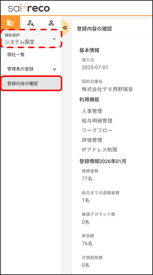 「登録内容の確認」とは何ですか? 2026年04月02日 10:04 更新 ご契約・ご請求に関する情報を確認するメニューです。※「登録内容の確認」は企業管理者アカウントからのみご確認いただけます 導入日 サイレコをご導入いただいた日付 導入日 サイレコをご契約いただいている企業名※グループ会社でサイレコをご利用の場合、主ご契約企業名 利用機能 ご利用中の機能一覧 登録情報 閲覧日の前月のアカウント情報 2026年2月10日に閲覧した場合:【2026年1月】の情報 登録者数 サイレコ内で管理されている、退職者も含めた全アカウント数 前月までの退職者数 退職者(請求対象外)のアカウント数サイレコで「退職者」かどうかは、どの情報をもとに判断されますか?※当月に退職する方のアカウントは、当月中は在職者として扱われます 無償アカウント数 無償アカウント数※社外の担当者をサイレコ管理者として登録する場合のみ、無償アカウントとして取り扱うことが可能です社外の担当者をサイレコの管理者にしたいのですが、追加の料金が発生しますか? 有効数 登録者数から前月までの退職者数、無償アカウント数を差し引いた、当月に請求対象となる在職者のアカウント数 月間削除数 当月中に削除したアカウント数※削除アカウントは、削除当月のみ請求対象となります 請求数 有効数と月間削除数を足した、当月の請求アカウント数 関連記事 会社名や住所が変更になった場合はどうしたらよいですか? サイレコで「退職者」かどうかは、どの情報をもとに判断されますか?