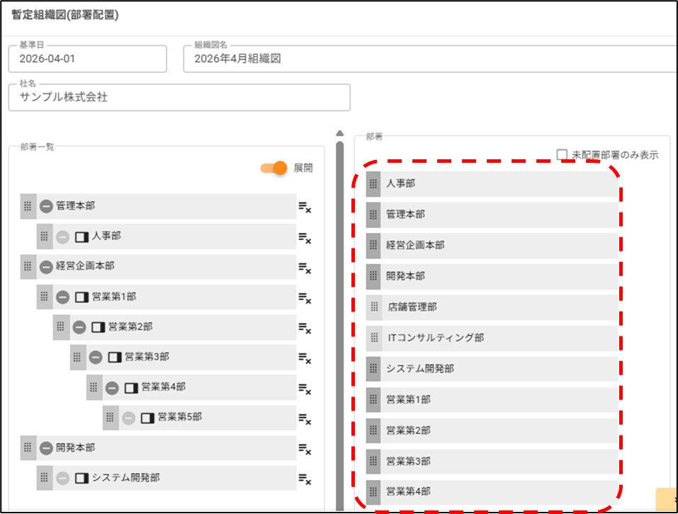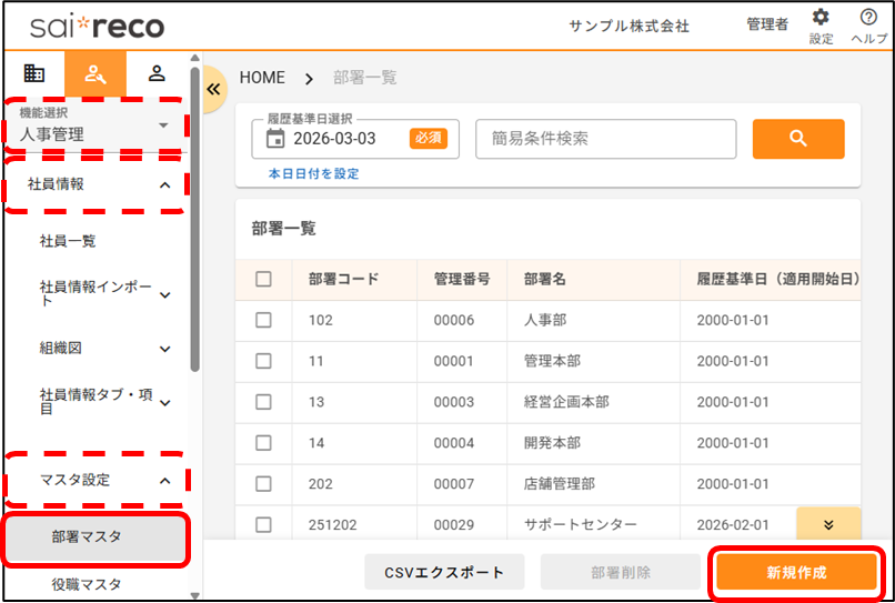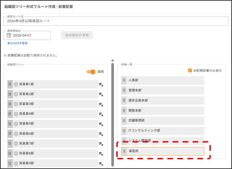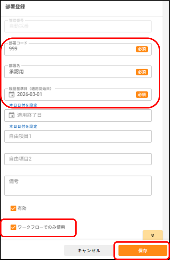 ワークフロー承認ルートに配置するための部署を作成したいです。どうすればいいですか? 2026年04月02日 10:01 更新 部署マスタを作成する際、「ワークフローでのみ使用」にチェックを付けます。※「ワークフローでのみ使用」にチェックを付けた場合、暫定組織図・確定組織図に該当部署を配置することはできなくなります。例)「承認用」という部署を作成する場合1.[人事管理>社員情報>マスタ設定>部署マスタ]から操作します [新規作成]をクリックします2.任意の部署コード・部署名を入力し、履歴基準日(適用開始日)を入力します。 「ワークフローでのみ使用」にチェックをつけ、[保存]をクリックします。※暫定組織図を作成する際、該当部署は部署一覧に表示されません※ワークフロー承認ルートを作成する際、該当部署は部署一覧にオレンジ色の枠線で表示されます