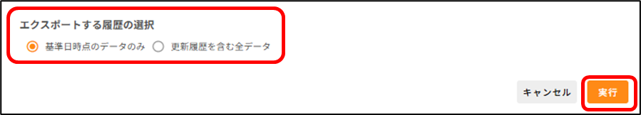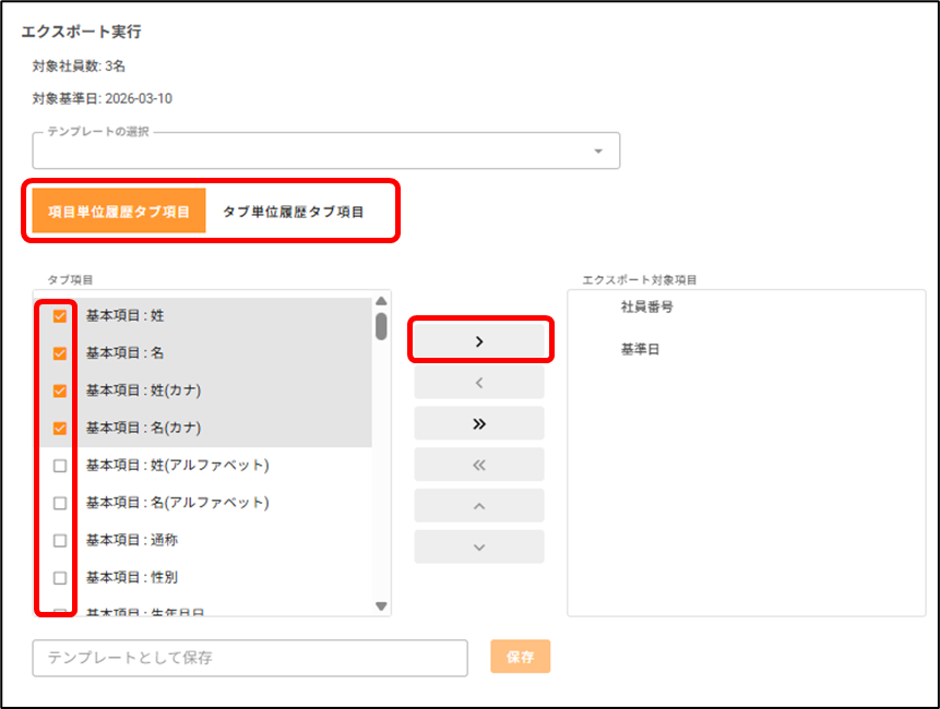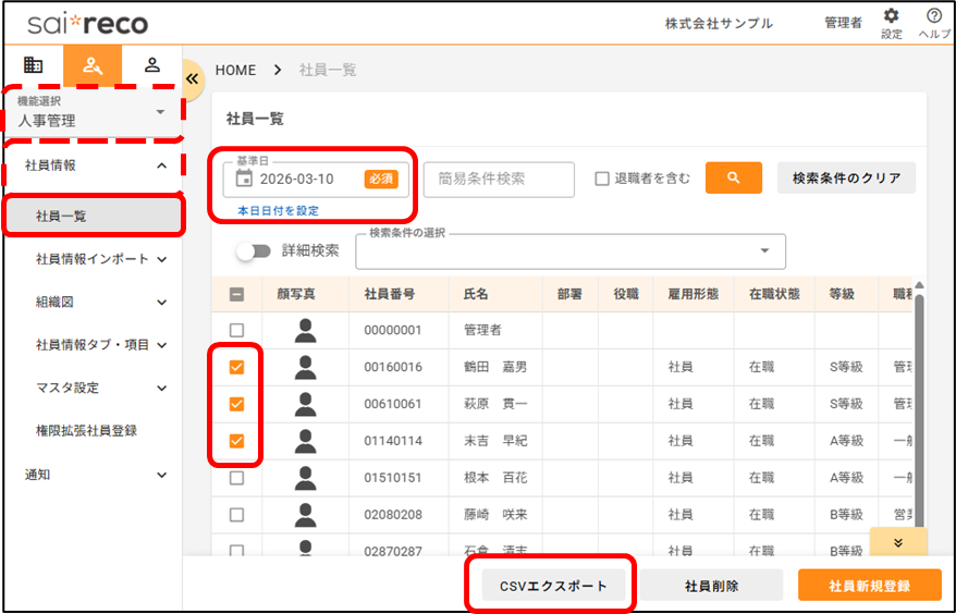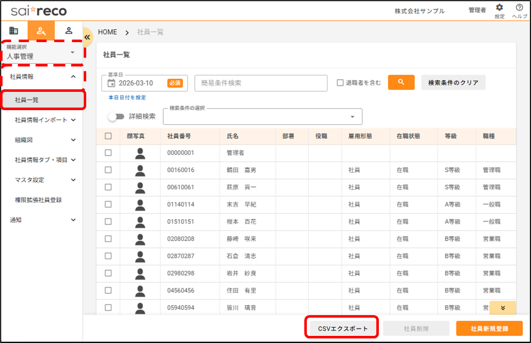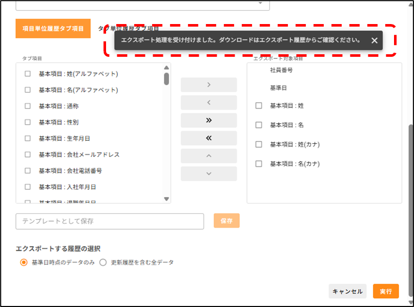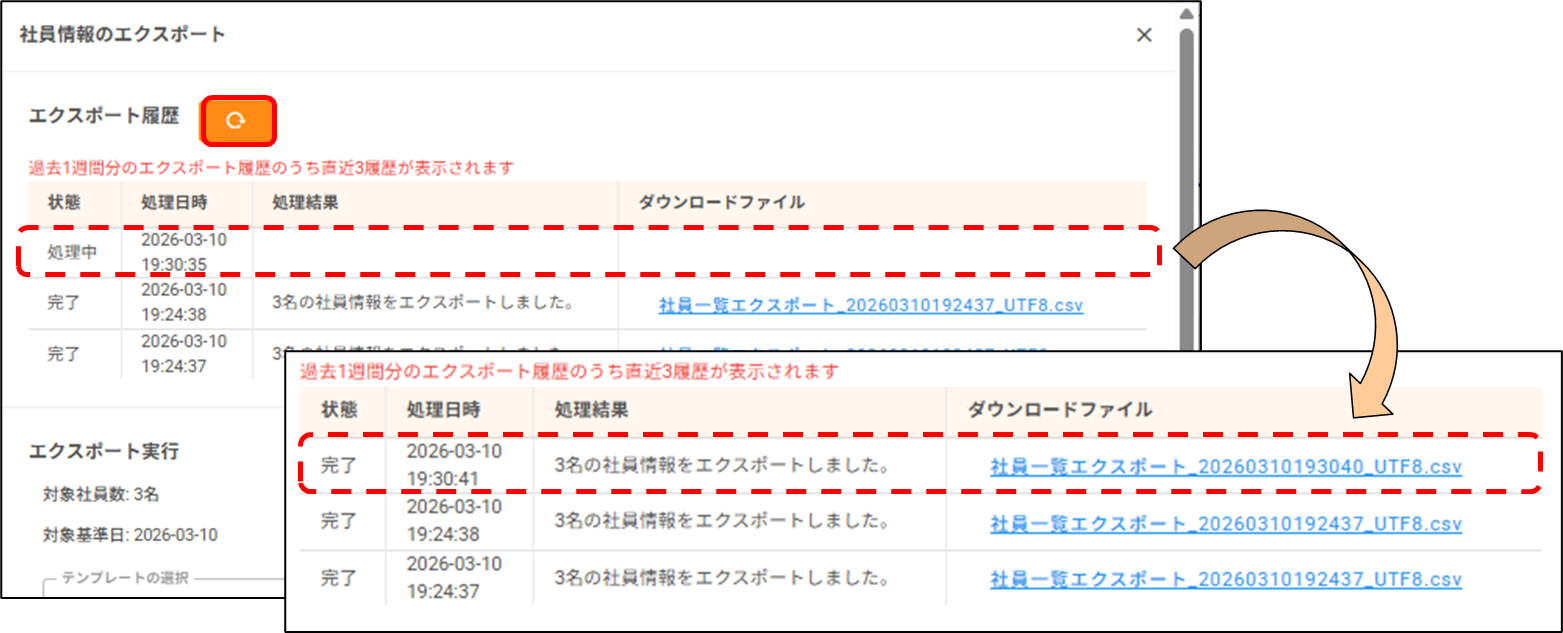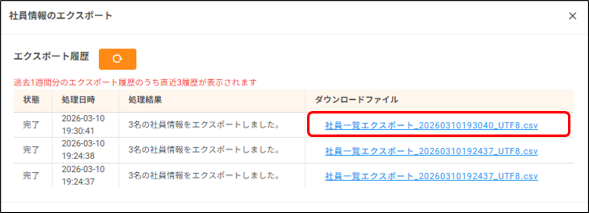 社員の情報を出力(エクスポート)したいです。どうすればいいですか? 2026年03月10日 11:10 更新 [人事管理>社員情報>社員一覧]から操作します。1.カレンダーをクリックし、情報を出力したい基準日を選択します。2.情報を出力したい社員にチェックをつけ、[CSVエクスポート]をクリックします。3.ポップアップ画面が表示されるので、出力対象項目を選択します。 タブの種類を選択し、出力したい項目にチェックを付けた状態で、[>]をクリックします。※「項目単位履歴タブ項目」と「タブ単位履歴タブ項目」を同時に出力することはできかねます。※「項目単位履歴タブ項目」は、タブを横断しての項目選択が可能です。※「タブ単位履歴タブ項目」は、単一タブ内での項目選択のみ可能です。4.エクスポートする履歴を選択します。 基準日時点のデータのみ:基準日時点で最新のデータを出力します。 更新履歴を含む全データ:基準日に関わらず、全データを出力します。未来日で登録された履歴も含みます。5.[実行]をクリックします。6.「エクスポート処理を受け付けました。ダウンロードはエクスポート履歴からご確認ください。」と表示されたら、出力処理が開始します。 処理中は、ポップアップ画面を閉じ、サイレコ内で別の作業を行っていただくことも可能です。7.しばらく時間が経ったら、ポップアップ画面上部の更新ボタンをクリックします。 状態が「処理中」から「完了」になったら、出力処理は終了です。※処理中に画面を閉じていた場合、[人事管理>社員情報>社員一覧]から[CSVエクスポート]をクリックすることで、ポップアップ画面に戻ることができます。8.記載のリンクをクリックすると、出力されたファイルをダウンロードできます。※出力されたファイルは、過去1週間分、直近3履歴が表示されます。 出力から1週間以上経ったファイル、4履歴以前のファイルは破棄されますので、ご注意ください。 関連記事 「タブ単位で履歴を残す」タブに登録した社員情報の履歴を確認したいです。どうすればいいですか?