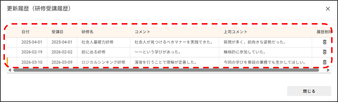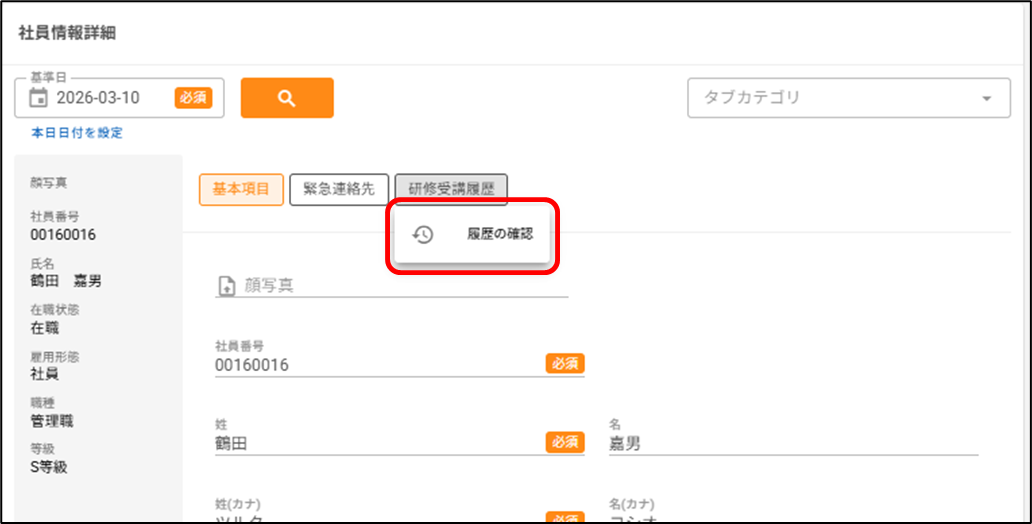「タブ単位で履歴を残す」タブに登録した社員情報の履歴を確認したいです。どうすればいいですか? 2026年03月10日 11:19 更新 [人事管理>社員情報>社員一覧]から操作します。1.履歴を確認したい社員の行をクリックします。2.履歴を確認したい「タブ単位で履歴を残す」タブにカーソルを合わせ、[履歴の確認]をクリックします。※「項目単位で履歴を残す」タブにカーソルを合わせても、[履歴の確認]は表示されません。3.タブ内の全項目の履歴が、一覧で表示されます。 関連記事 社員の情報を出力(エクスポート)したいです。どうすればいいですか? 初期導入手順/管理者マニュアル