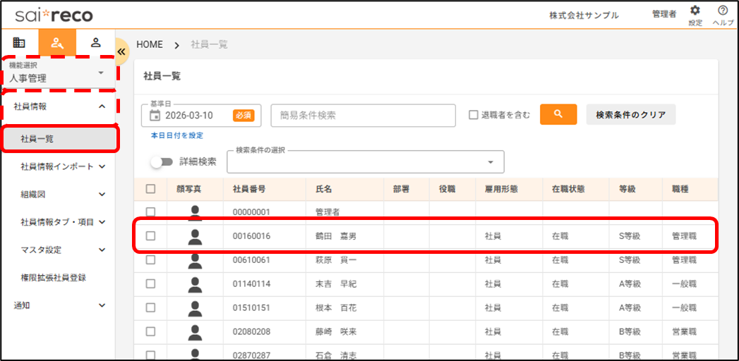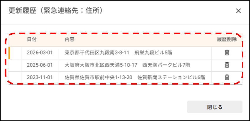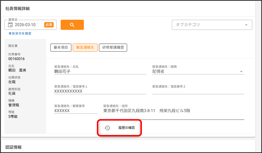 「項目単位で履歴を残す」タブに登録した社員情報の履歴を確認したいです。どうすればいいですか? 2026年03月12日 12:27 更新 [人事管理>社員情報>社員一覧]から操作します。1.履歴を確認したい社員の行をクリックします。2.履歴を確認したい「項目単位で履歴を残す」タブの項目にカーソルを合わせ、[履歴の確認]をクリックします。※「タブ単位で履歴を残す」タブの項目にカーソルを合わせても、[履歴の確認]は表示されません。3.項目の履歴が一覧で表示されます。