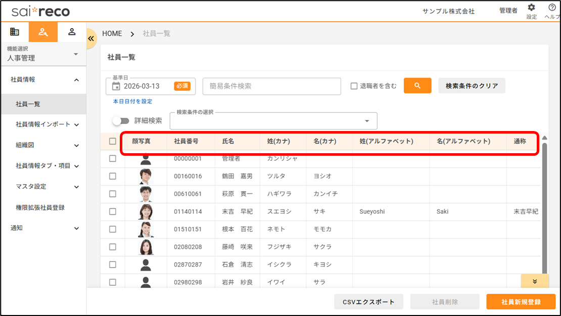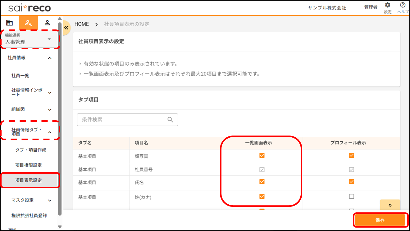 社員一覧に表示する項目を追加したいです。どうすればいいですか? 2026年03月13日 12:46 更新 [人事管理>社員情報タブ・項目>項目表示設定]から操作します。1.社員一覧に追加したい項目の「一覧画面表示」欄にチェックを付けます。※社員番号は必須表示ですので、チェックを外すことはできかねます※社員一覧には最大20項目まで表示することが可能です2.[保存]をクリックします。