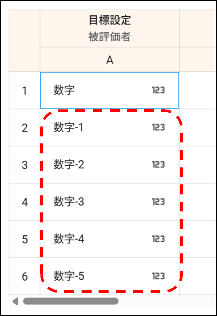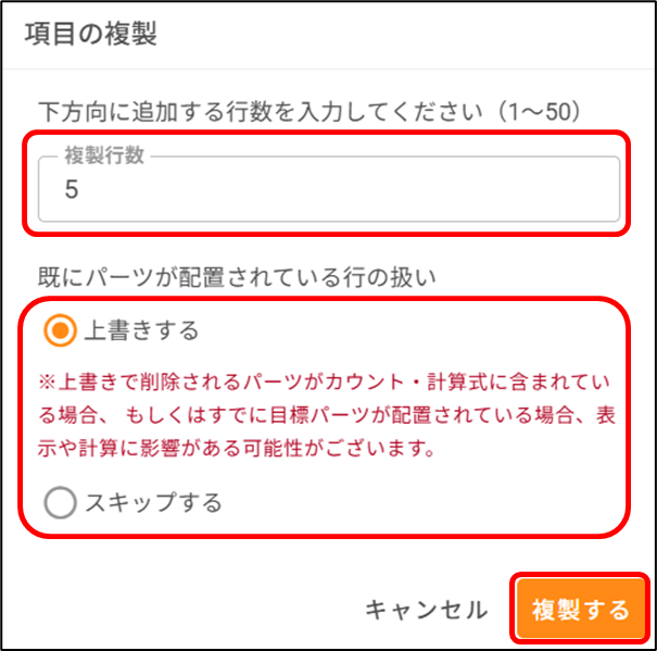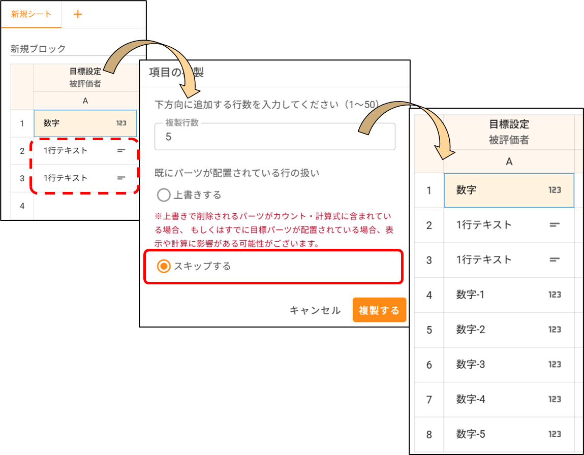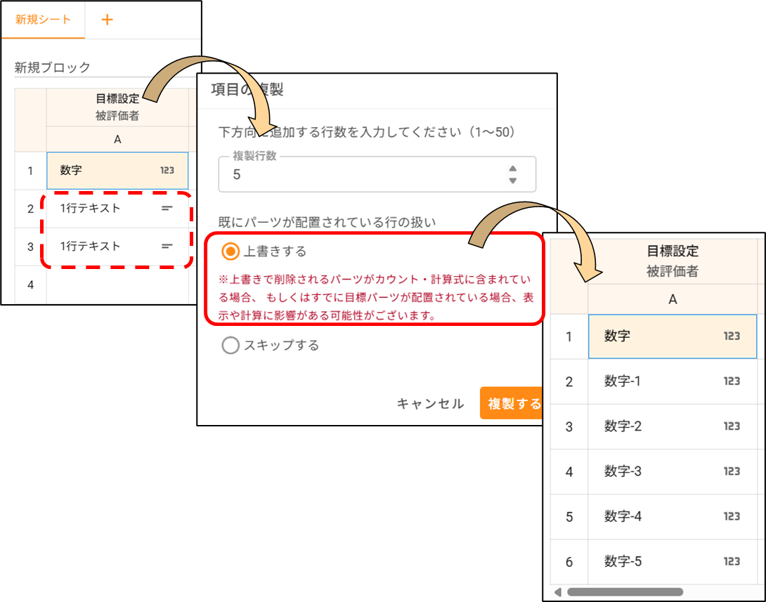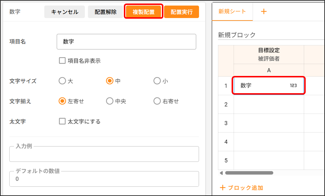 評価テンプレートで同じパーツを複数のセルに一括配置することはできますか? 2026年04月03日 00:01 更新 縦に一括配置することは可能です。※横に一括配置することはできかねます。設定方法は、以下の通りです。1.複製したい項目をクリックし、[複製配置]をクリックします。※[複製配置]をクリックした時点の情報が複製されますので、事前に設定を行ってください。2.一括配置したい行数を1~50から入力します。 「既にパーツが配置されている行の扱い」を選択し、[複製する]をクリックします。3.入力した行数分、項目が複製されます。※「既にパーツが配置されている行の扱い」で「上書きする」を選択した場合、行に配置されている項目に上書きして配置されます※「既にパーツが配置されている行の扱い」で「スキップする」を選択した場合、行に配置されている項目をスキップして配置されます 関連記事 社員情報一覧に表示させる項目を追加することはできますか?