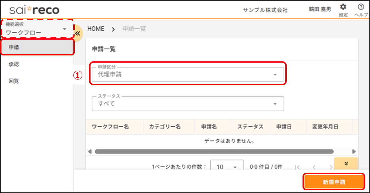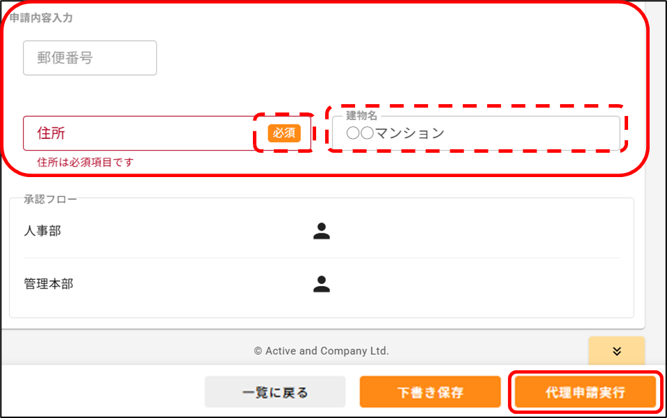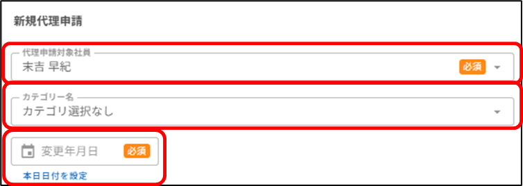 【社員アカウント】代理申請はどのように行いますか? 2026年04月01日 09:37 更新 操作方法は、以下の通りです。※代理申請は、権限を付与されたアカウントでのみ、指定された社員を対象に行えます。[ワークフロー>申請]から操作します。1.申請区分で「代理申請」を選択し、[新規申請]をクリックします。2.代理申請を行う対象となる社員を選択します。 カテゴリーを選択します。※カテゴリーの選択は任意です。選択すると、ワークフローの絞り込みが可能です。 変更年月日を選択します。3.ワークフロー名を選択し、申請名を入力します。※デフォルトでは、ワークフロー名が転記されます 申請理由を入力します。※設定によって、申請理由欄は存在しない場合があります 4.申請内容を入力します。 ※ 「必須」がついている項目は必須入力です 空欄だと申請することができません ※すでに登録された内容がある場合、変更年月日時点の最新情報が入力された状態になります 入力が完了したら、[代理申請実行]をクリックします。 関連記事 「入社年月日」と「入社年月日の基準日」を別の日付にするためには、どうすればいいですか?