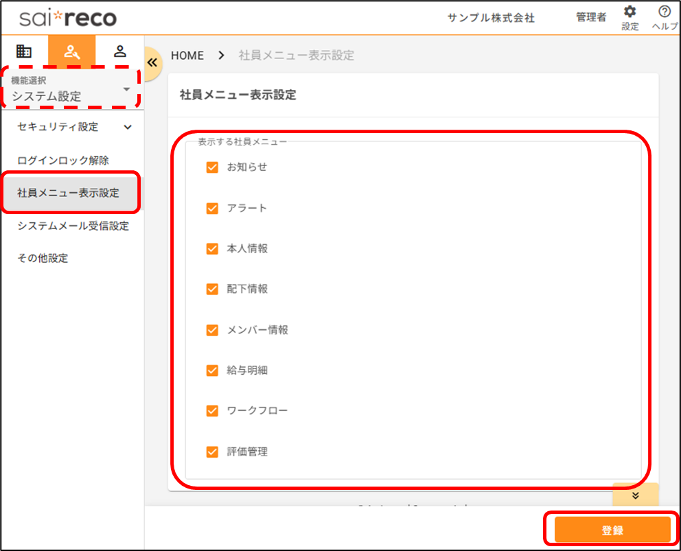 社員アカウントで使用していないメニューを非表示にすることはできますか? 2026年04月01日 09:35 更新 社員メニュー表示設定を行うことで、可能です。[システム設定>社員メニュー表示設定]から設定します。1.社員アカウントで表示したい社員メニューにチェックをつけます。※画面には現在ご契約されているメニューのみ表示されます。2.[登録]をクリックします。 関連記事 【社員アカウント】パスワードを変更したいです。どうすればいいですか? 基本項目タブに入力規則はありますか?