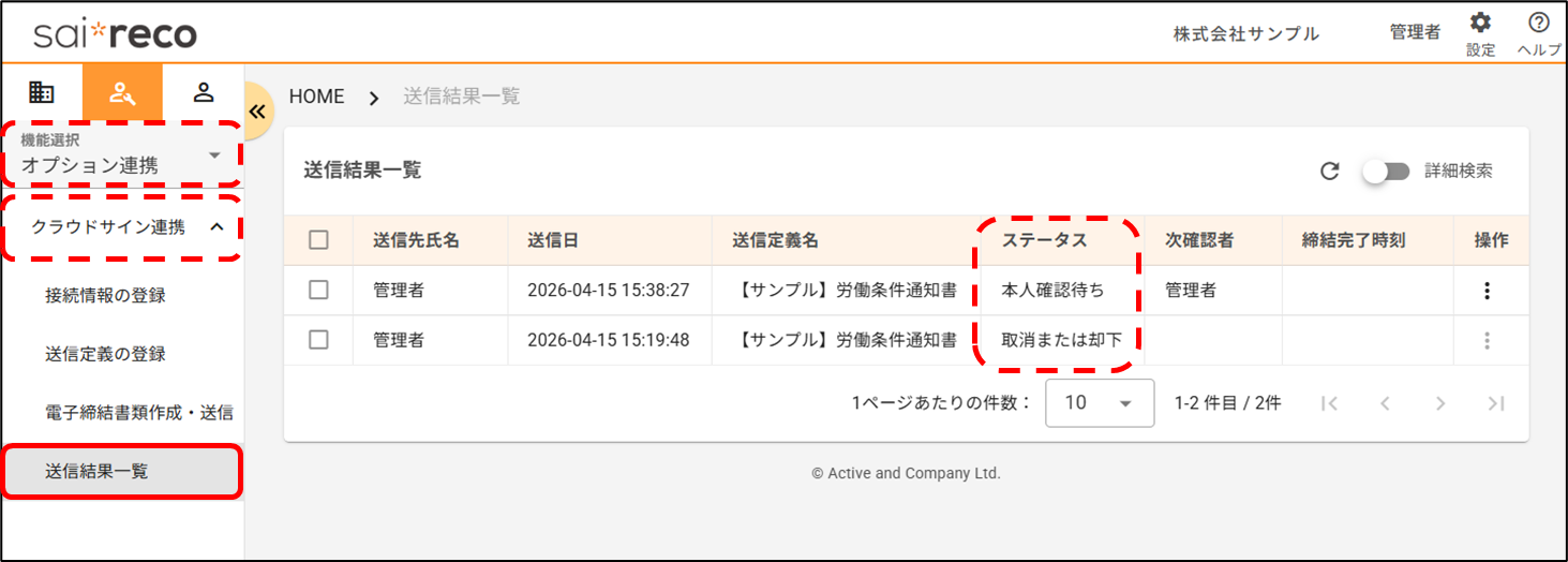 クラウドサイン連携で送信した書類の締結状況を、サイレコから確認できますか? 2026年04月24日 05:28 更新 はい、送信結果一覧から確認することが可能です。【ステータス】確認待ち:クラウドサイン確認者の確認待ち状態本人確認待ち:本人の確認待ち状態締結済:書類の締結が完了した状態取消、または却下:確認者・本人が却下を行った状態、または管理者が送信取消を行った状態