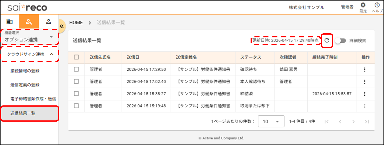 クラウドサイン連携の「送信結果一覧」に記載されたステータスが、クラウドサイン側のものと違います。どうしてですか? 2026年04月24日 05:28 更新 更新が行われていないためです。更新を行っていただくことで、最新のステータスが表示されます。※最後に更新した日時が記載されます。
