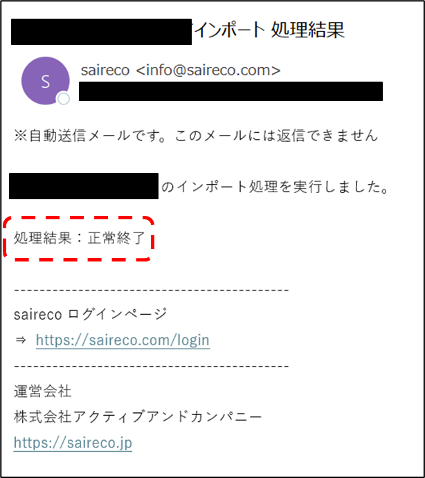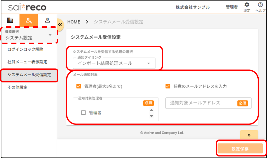 「インポートが完了しました」と表示されますが、社員情報を確認するとデータが登録されていません。どうすればいいですか? 2026年04月17日 09:07 更新 サーバーとの通信時にエラーが発生している可能性がございます。インポート結果処理メールから、エラー状況をご確認ください。インポート結果処理メールの受信設定方法[システム設定>システムメール受信設定]から操作します。1.システムメールを受信する処理の選択で「インポート結果処理メール」を選択します。2.メール通知対象者を選択します。 対象者は管理者(最大5名まで)か、任意のメールアドレスから選択できます。3.[設定保存]をクリックします。