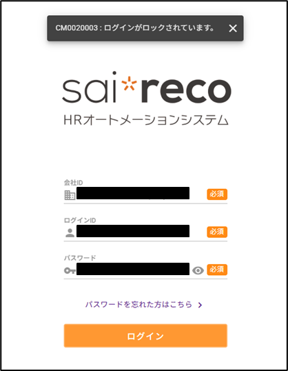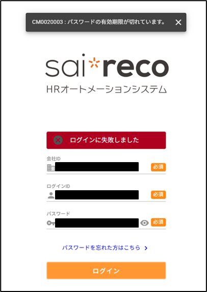 ログインできません。どうすればいいですか? 2026年04月20日 01:27 更新 表示されるエラーメッセージをご確認ください。 ログインに失敗しました ログインがロックされています パスワードの有効期限が切れています ログインに失敗しました会社ID、ログインID、パスワードのいずれかが誤っています。入力内容をご確認ください。 ログインがロックされていますログイン失敗回数の上限を超えたため、ログインがロックされています。時間経過、もしくは管理者によるロックの解除が必要です。詳細は、貴社のサイレコ管理者様までお問合せください。 パスワードの有効期限が切れていますパスワードの有効期限が切れています。[パスワードを忘れた方はこちら>]から、新しいパスワードの設定を行ってください。