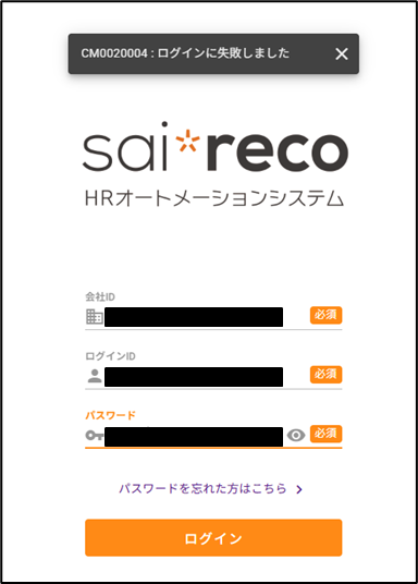【社員アカウント】ログインできません。どうすればいいですか? 2026年04月20日 01:27 更新 表示されるエラーメッセージをご確認ください。 ログインに失敗しました ログインがロックされています パスワードの有効期限が切れています ログインに失敗しました会社ID、ログインID、パスワードのいずれかが誤っています。入力内容をご確認ください。 ログインがロックされていますログイン失敗回数の上限を超えたため、ログインがロックされています。時間経過、もしくは管理者によるロックの解除が必要です。詳細は、貴社のサイレコ管理者様までお問合せください。 パスワードの有効期限が切れていますパスワードの有効期限が切れています。[パスワードを忘れた方はこちら>]から、新しいパスワードの設定を行ってください。