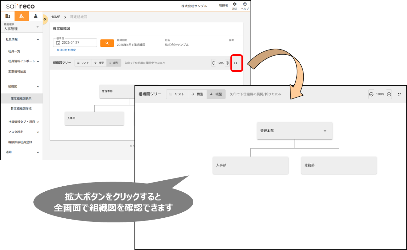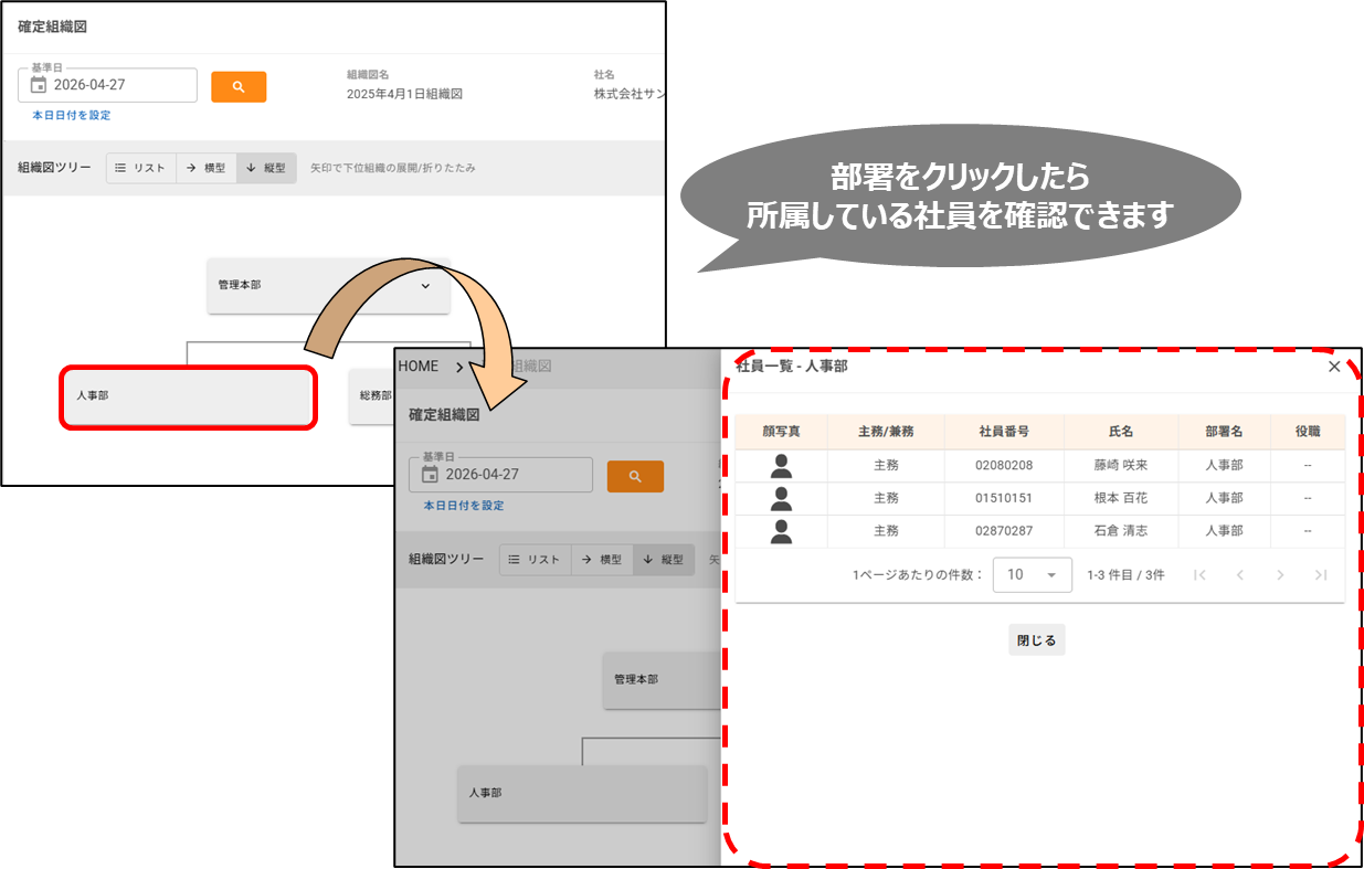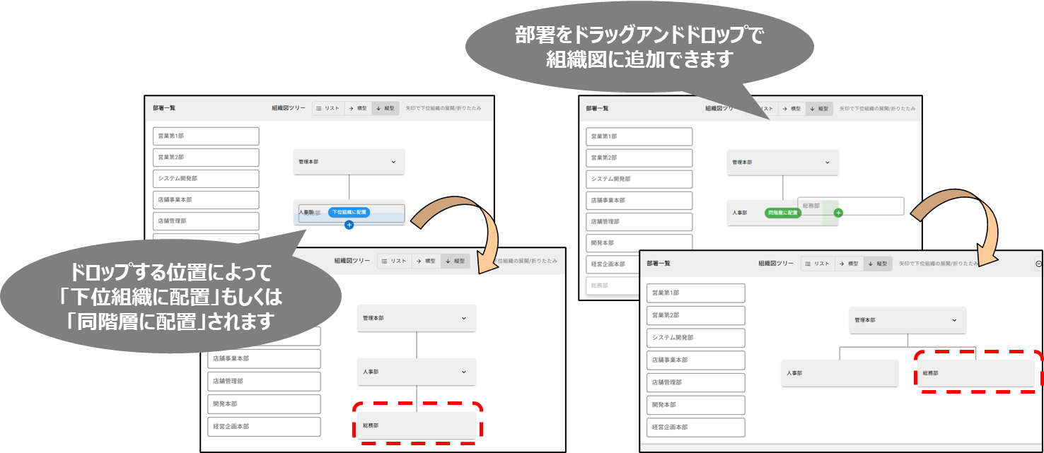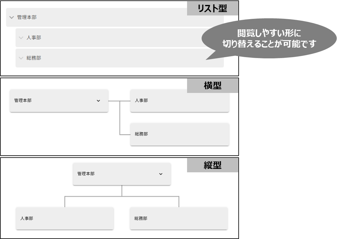 2026年4月27日更新 【仕様変更】組織図の縦型・横型表示が可能になります 2026年04月27日 10:30 更新 【仕様変更】組織図の縦型・横型表示が可能になります(目的)組織図の部署間の上下関係・同列関係をより直感的に把握できるようにし、組織改編や要員計画などの検討を進めやすくするため。(改修前)組織図はリスト型での表示のみでした。部署を配置する際は左右に段差をつけて並べる必要があり、どの部署がどこの上位部署に当たるのかを確認しづらい状態でした。そのため、組織改編時の影響範囲確認に時間がかかり検討作業が進めにくいことがありました。(改修後)組織図の表示形式を「リスト型」「縦型」「横型」に切り替えできるようになりました。上下関係や同列の部署がどこに当たるのかが見やすくなり、組織全体の構造を把握しやすくなります。また全画面編集にも対応したため、より広い表示領域で配置・編集作業を行えるようになります。その結果、組織の現状把握や設定作業がスムーズになり、組織設計検討・要員計画検討などの戦略業務にリソースを割けるようになります。確定組織図暫定組織図